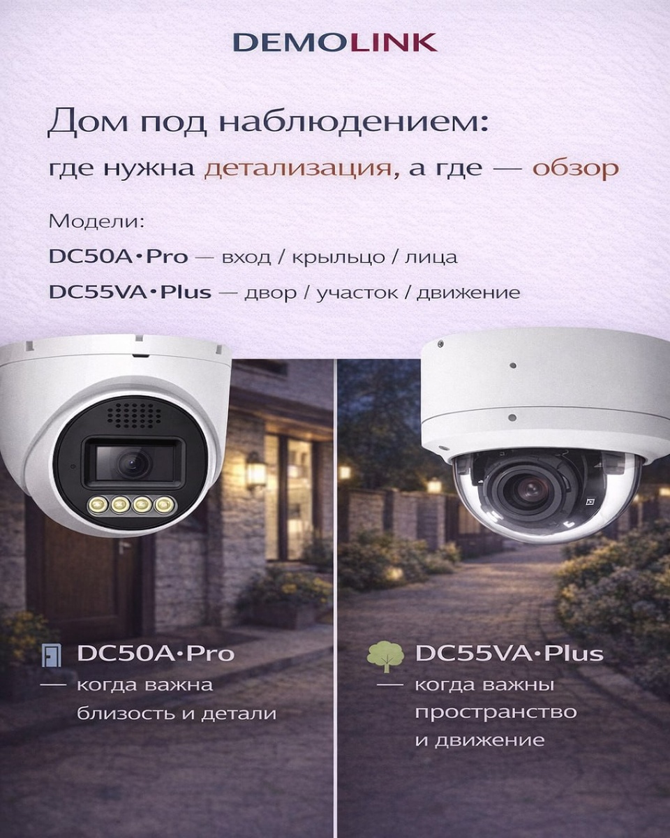 Модели: DC50A·Pro — вход / крыльцо / лица DC55VA·Plus — двор / участок / движение В частном доме редко возникает вопрос «нужна ли камера». Гораздо чаще — какая именно и куда 👀 Именно здесь и появляется типичная ошибка: один и тот же подход пытаются применить к разным зонам. 🚪 DC50A·Pro — когда важна близость и детали Вход и крыльцо — это работа на короткой дистанции. Здесь важны лица, мимика, мелкие действия, а не общая картина территории. DC50A·Pro с фиксированным объективом 3.6 мм и разрешением 4 Мп рассчитана именно на такие условия. Она даёт плотное, собранное изображение вблизи, уверенно держит контрастный свет у двери и не «растворяется» в лишнем пространстве. Это камера, которая отвечает на вопрос: кто подошёл к дому и что происходит прямо у входа 🚪 🌳 DC55VA·Plus — когда важнее пространство и движение Двор и участок — другая логика наблюдения. Здесь важна не каждая деталь, а понимание, что происходит на территории в целом. DC55VA·Plus с автофокусным объективом 2.7–