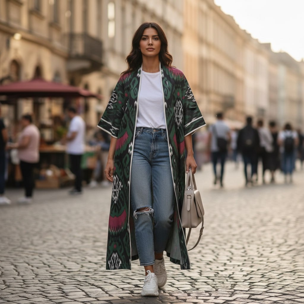И когда вы надеваете такую вещь поверх самого простого комплекта — миди-платья, джинсов с белой футболкой или строгого костюма — образ вдруг становится теплее, живее. Такие вещи сложные, а сложность в образе всегда считывается как уверенность. На иллюстрациях визуализирован шелковый адрас "Качкарча".