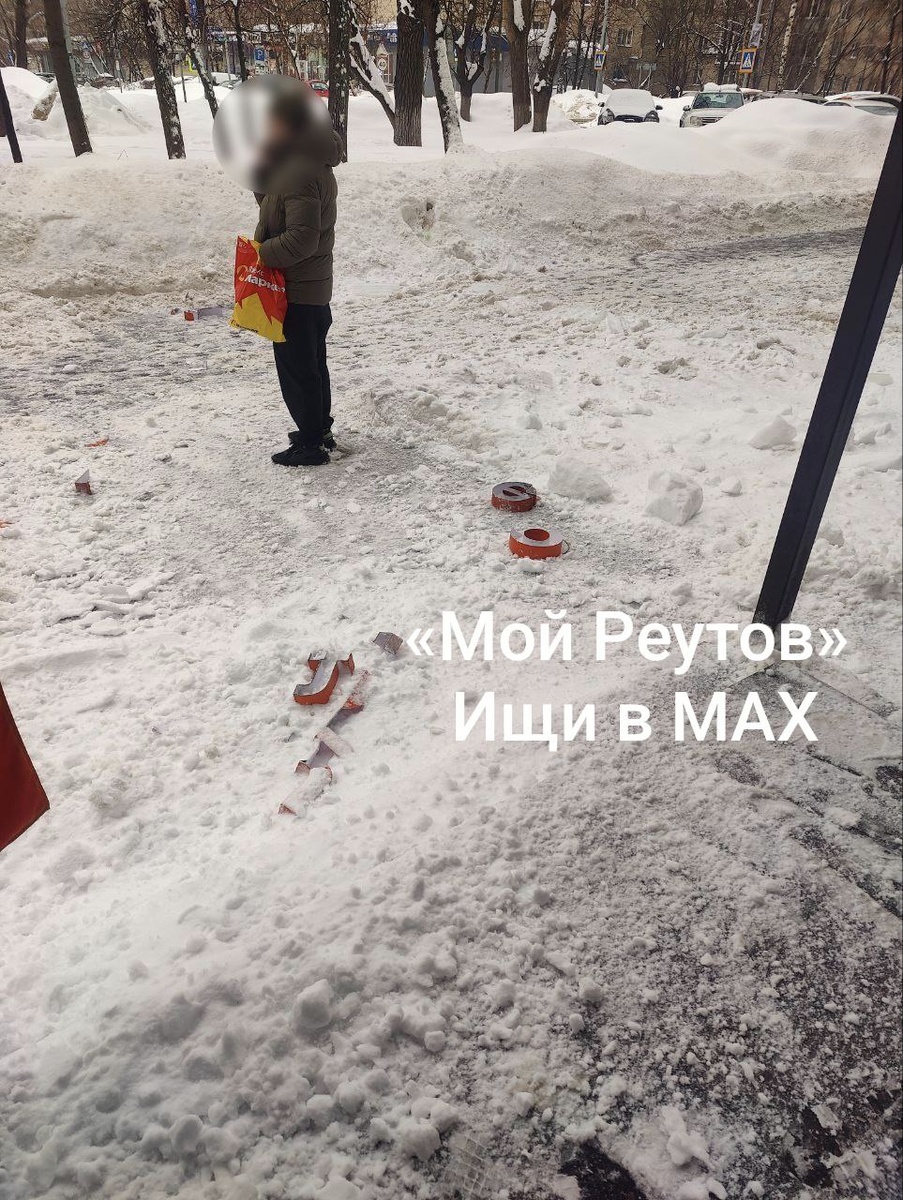 "Здравствуйте, по улице Ленина 4 с крыши падают огромные глыбы льда. Сейчас сошла, обдав меня снегом и сбив вывеску!!! За несколько секунд до этого решила зайти под козырёк магазина. Сходит не снег, а огромные глыбы льда! Предупредите людей, участок оживленный и совсем не огорожен." #отподписчиков «Мой Реутов» в MAX: https://max.ru/reutov_today