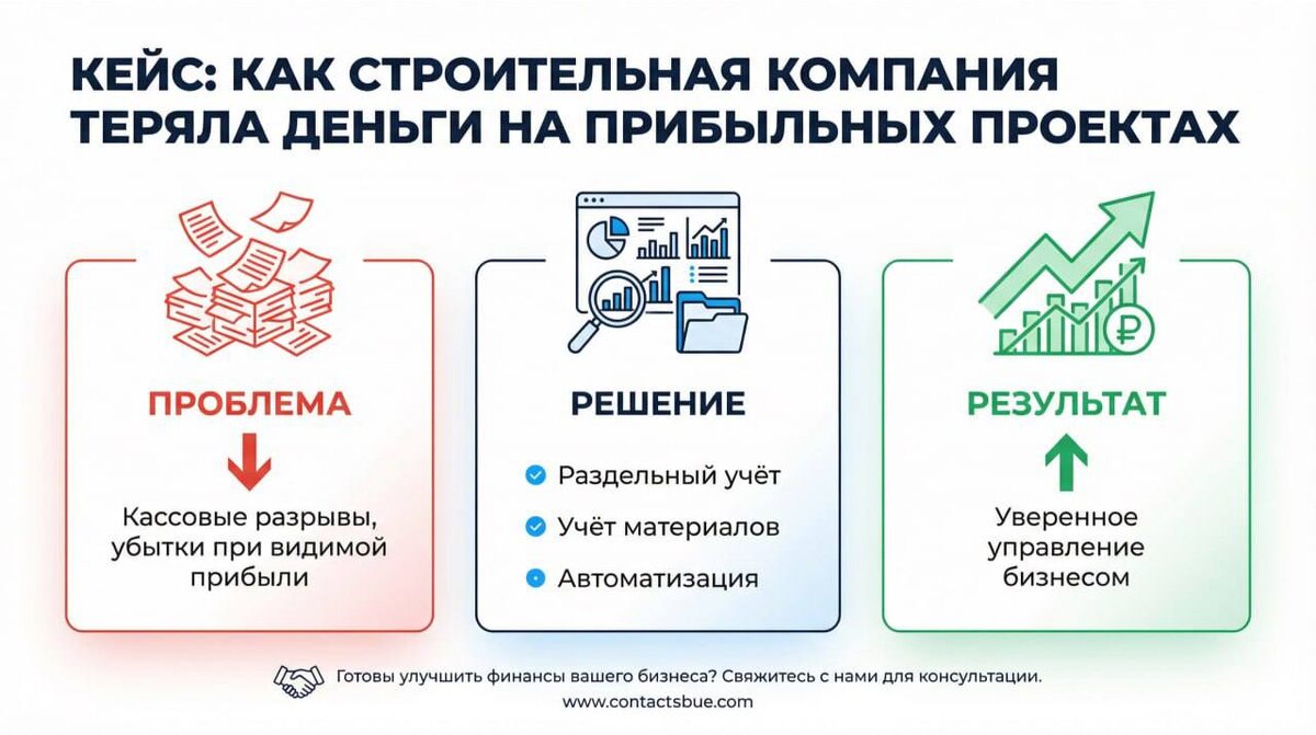Дано: Строительная компания с несколькими крупными объектами. На бумаге — всё отлично, проекты выглядят прибыльными. По факту — постоянные кассовые разрывы и непонятные убытки. Собственник тушит пожары, вместо того чтобы управлять бизнесом. Проблема: «Слепой» учёт Вы можете построить объект на миллионы и… уйти в минус. И причина чаще всего не в продажах, а в том, как выстроен финансовый учёт. В строительстве цена такой ошибки особенно высока. Один неучтённый договор или задержка оплаты подрядчику — и проект «падает» в убыток. ❗️Именно это и происходило. Без раздельного учёта по объектам все деньги сваливались в «общий котёл». Прибыль от одного проекта тут же «съедалась» убытками другого. А где именно бизнес растёт, а где — утекают деньги, было не видно. Решение: Внедрение системы финансового учёта Чтобы получить реальную картину бизнеса, а не просто набор цифр, мы внедрили 3 ключевых элемента: 1️⃣ Раздельный учёт по объектам. Каждый проект — это отдельный бизнес. Теперь компания ви