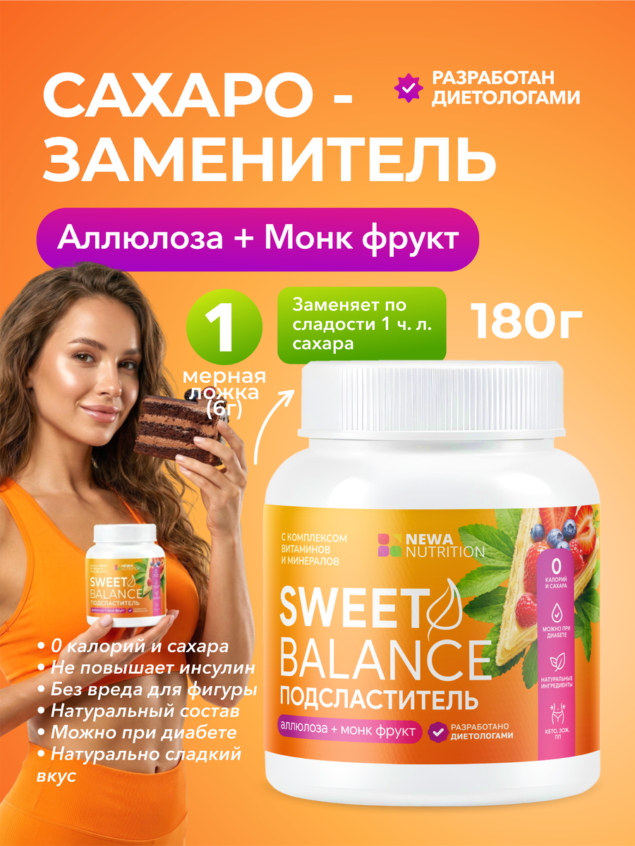 Сладкое — это удовольствие. Но цена обычного сахара слишком высока: лишние сантиметры, скачки инсулина, усталость и риски для здоровья. Хорошая новость: теперь можно есть сладко и не жертвовать фигурой! Встречайте сахарозаменитель от NEWA Nutrition на основе Аллюлозы и Монк Фрукта — натуральный, безопасный и невероятно вкусный. Это дуэт двух мощных природных подсластителей: 🍇 Аллюлоза (D-псикоза)