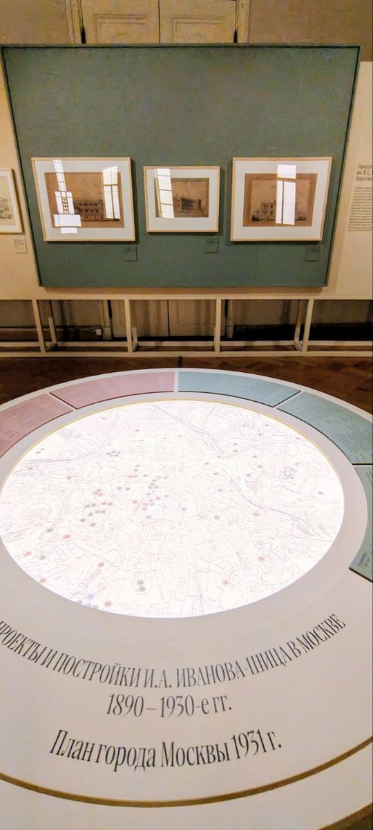 :-) Если критикуешь — надо что-то предлагать, правда? Так вот В Музее архитектуры сейчас идёт выставка «Илларион Иванов-Шиц. Полвека на службе Москве». На выставке представлены графические листы, эскизы, проекты, чертежи и фотографии — то есть что-то, что неспециалистам нужно преподнести, либо с помощью комментария экскурсовода, либо с помощью логики оформления и организации пространство. И на этой выставке сделано всё очень здорово. Анфилада МУАРа, где проходит выставка — узкая, длинная и ещё с довольно активным оформлением в стиле 18 века (кто там окажется — не забывайте голову наверх поднимать). И к каждой выставке она преображается почти до неузнаваемости. На выставке Иванова-Шица оформление воспроизводит то детали оформления памятника Пушкину к юбилейным торжествам, то части его знаменитых построек (а их многие видели и знают, просто с именем архитектора эти здания не соединяются). Такое оформление: ❤️ отчасти решает один из главных парадоксов Музея архитектуры — показат