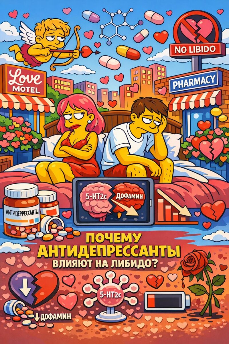 Но почему так происходит? С Лайфхакером готовим материал о сексуальных нарушениях во время терапии антидепрессантами. Информация о механизмах, лежащих в основе, важна, поэтому публикую первую часть для вас в своем канале. Уверен, среди вас есть те, кому интересно. Почему антидепрессанты влияют на влечение (либидо) Сексуальное желание в значительной степени связано с дофаминергической активностью в мезолимбической системе. ▪️Активация серотониновых 5-HT2C-рецепторов способствует снижению активности дофаминергических (и частично норадренергичнских) нейронов в мезолимбических и префронтальных цепях. В результате: меньше мотивации, меньше интереса, меньше желания. ▪️Серотонин усиливает активность ГАМК-ергических нейронов, тормозящих дофаминовые. Как результат — торможение системы вознаграждения. ▪️В редких случаях антидепрессанты могут вызывать умеренную гиперпролактинемию, а это влечет снижение гонадотропной стимуляции и, как следствие возможно снижение уровня тестостерона и эстрог