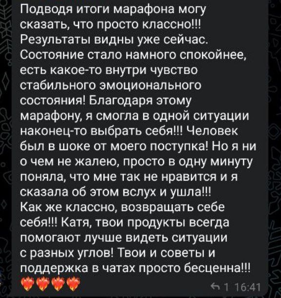 🩷🩷🩷🩷🩷🩷 С марафона медитаций. Ой как приятно читать такие слова. Меня это каждый раз мотивирует и вдохновляет делать для вас что-то особенное важное и нужное 💜 В марафоне все ещё можно принять участие. Вы ещё успеваете! Если есть сомнения – гоните прочь, это мозг играет свои игры. Кто интересовался: "А можно ли чуть позже присоеденится?" Да, есть такая возможность сейчас присоединится к тем, кто уже работает с собой, видит результаты, создает для себя лучшие изменения, начинает слушать и слышать не только свой беспокойный мозг, а что-то большее: свою интуицию, связь с высшим Я, со своим духом и Миром/Вселенной/Создателем/Родом. БЕСЦЕННО🩷 Благодарю за обратную связь и делюсь с отзывом с людьми. Знаю, многим важно тоже видеть, что там происходит на марафоне и что за результаты случаются. 💎💎💎 Жизнь в ресурсе 🍀
