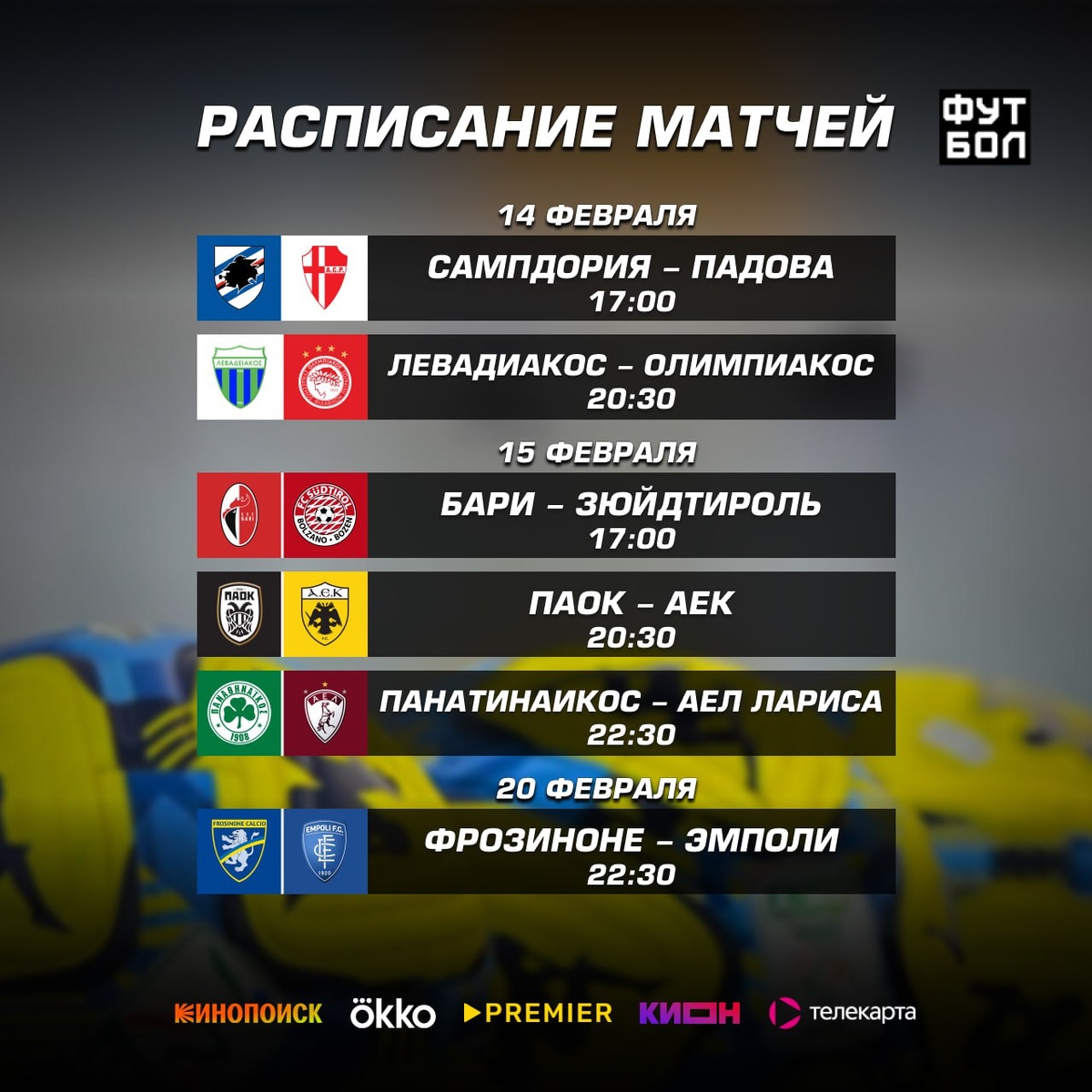 » 14 февраля в 17:00 Сампдория-Падова 14 февраля в 20:30 Левадиакос-Олимпиакос 15 февраля в 17:00 Бари-Зюйдтироль 15 февраля в 20:30 ПАОК-АЕК 15 февраля в 22:30 Панатинаикос-АЕЛ Лариса 20 февраля в 22:30 Фрозиноне-Эмполи Посмотрим битву середняков Серии B между Сампдорией и Падовой, понаблюдаем за выездом Олимпиакоса, увидим «Дерби двуглавых орлов» между ПАОК и АЕК, а также попадём на домашний матч Панатинаикоса. 📺 Это мы смотрим!