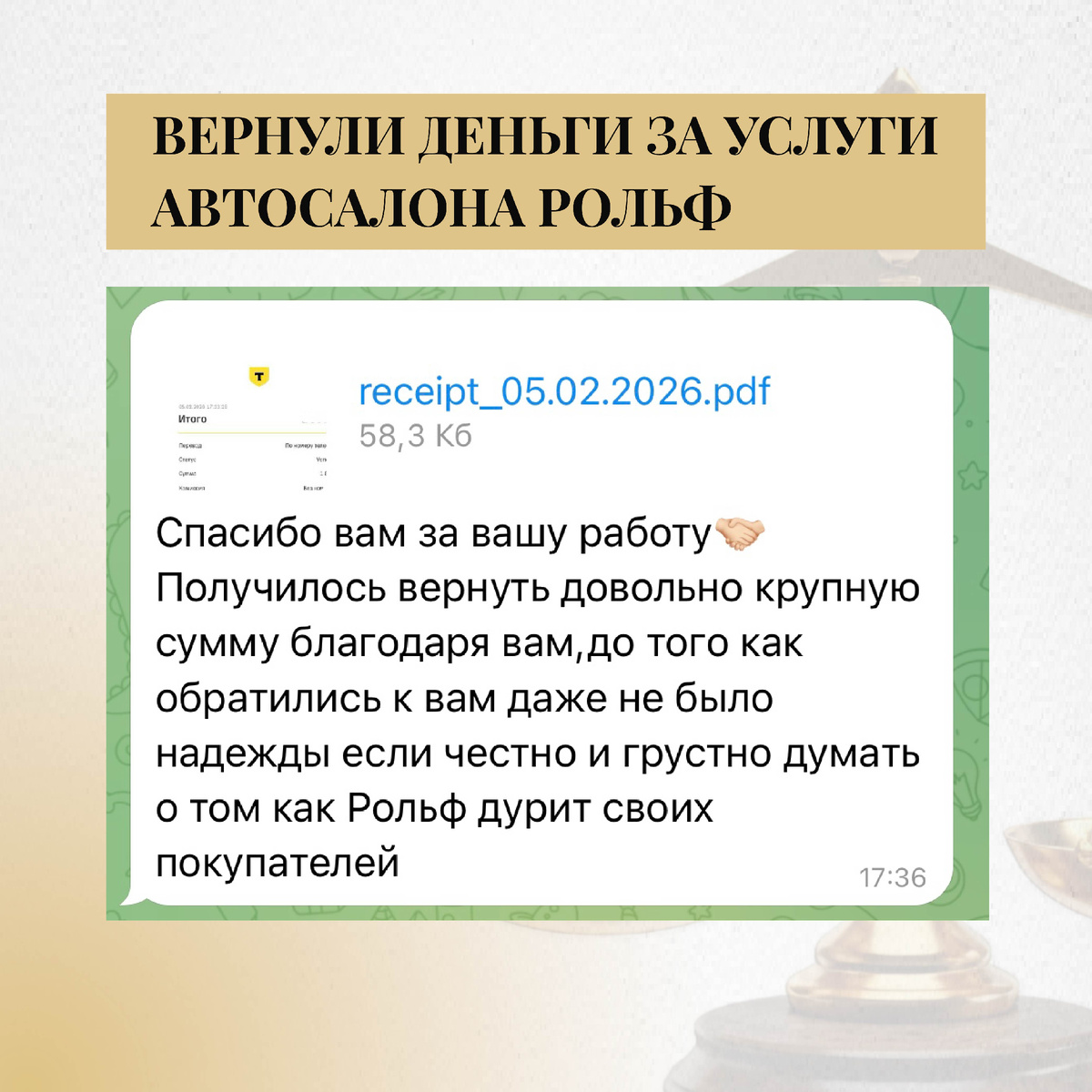 13.08.2025г. клиенту при покупке авто в автосалоне АО «РОЛЬФ» г. Москвы были навязаны пять доп.услуг от разных компаний. Стоимость всех услуг оплачена за счет кредита. Клиент обратился ко мне за анализом ситуации. После изучения документов мы заключили договор и приступили к работе: В данной ситуации большую часть денег удалось вернуть по досудебным претензиям, что бывает не так часто, особенно с некоторыми компаниями. Чаще всего дела доходят до обращений к банку или финансовому уполномоченному. Всего клиенту вернули 511 500р. Бесплатный анализ вашей ситуации: изучу документы и опишу перспективы отказа от навязанных услуг Больше статей, ситуаций из своей юридической практики и отзывов клиентов я публикую: