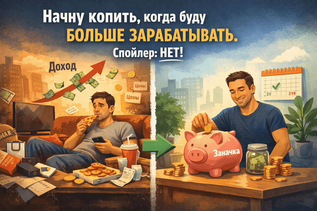 Я долго был уверен, что откладывать буду когда доход вырастет. Типа сейчас и так впритык, вот будет больше, тогда и начну. Доход подрос, цены тоже, а откладывать так и не начал. Когда я всё-таки решил, мне казалось: если отложить хоть какую то сумму - вот именно её обязательно не хватит в конце месяца. Как же я тогда ошибался 😂 Я начал с простого правила: 10% со всех доходов без исключений. Самое сложное было отучить свой мозг не видеть эти деньги. Если он видит - считает своими. Поэтому, я убрал их на отдельный счёт в другой банк. Через месяц смотрю - живу без них точно также 😁 Зато впервые появилось ощущение, что у меня есть запас. 10% - это не магия. Это просто сумма, с которой можно начать без боли. Это как съесть 9 пельменей из 10. Голодным не останешься. Если денег не хватает сейчас, то отложив 10% ровно так же не будет хватать, как и без них. Сейчас я эту заначку даже не замечаю, хотя все деньги лежат в одном банке. Со временем это входит в привычку, так сильно,