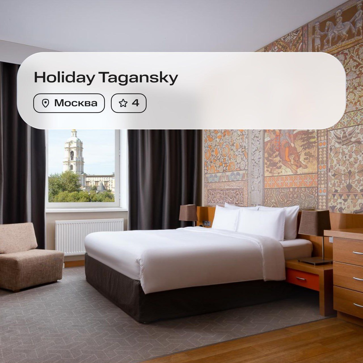 📍Holiday Tagansky 4* Отель расположен в центре Москвы, в нескольких минутах от станции метро «Пролетарская». Красная площадь, Кремль и другие главные достопримечательности — в быстрой доступности. К услугам гостей 220 современных просторных номеров различных категорий. На первом этаже работают ресторан и лобби-бар.