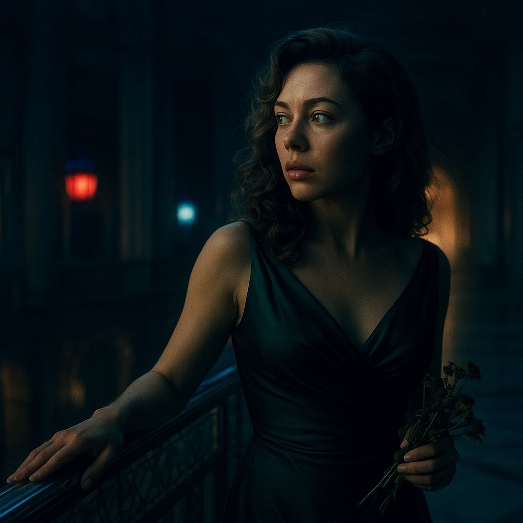 » ** 🎨 Промпт: ** A cinematic noir portrait of the woman from the reference photo, her facial likeness unchanged. She pauses in the cavernous art deco hotel lobby, trailing a hand along a gleaming chrome and inlaid-mother-of-pearl railing, her head turned slightly as if catching a distant sound. She wears a glamorous Hollywood golden age gown in deep emerald silk, clutching a wilting bouquet of wildflowers. The scene is bathed in the romantic, dreamy twilight of blue hour, vibrant jewel tones of ruby and sapphire glass lamps glowing against the shadows. She is dramatically backlit by a distant archway, creating a soft lens flare and long, elegant shadows. Shot on 35mm film with natural grain, high contrast. Банк Промптов | Твои Идеи