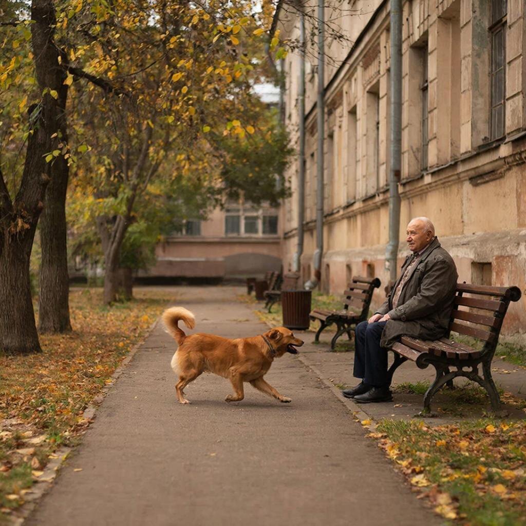 Собака приплясывала от возбуждения. Она всем своим видом показывала, что очень очень очень рада их встрече. Просто счастлива, что хозяин её узнал. Хвост готов был оторваться, вращаясь без устали. Наконец мужчина, привстав, сел на скамейку.
