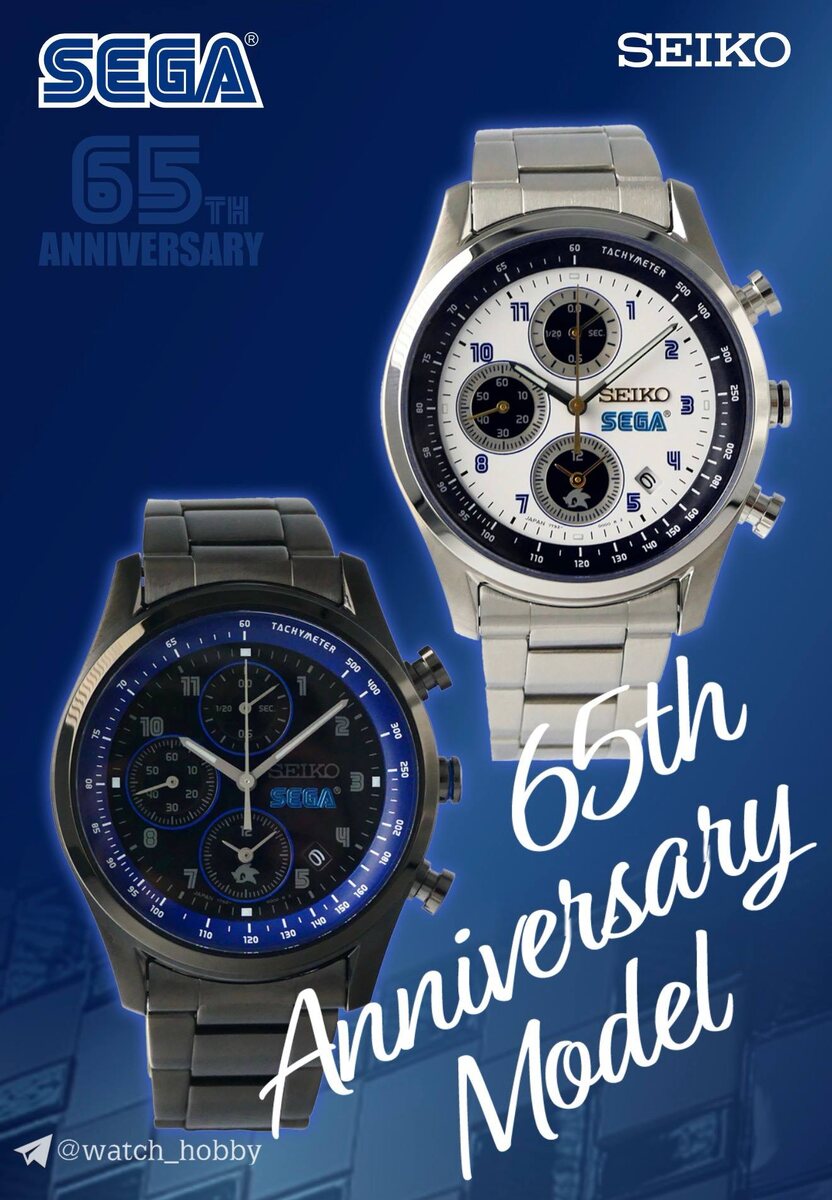 В честь 65-летнего юбилея компании SEGA представлены две вариации кварцевого хронографа. Оба получили ежа на циферблат 🏃♂️ Что с характеристиками: - Корпус из стали - Браслет из стали - Циферблат с логотипами компаний - Размер корпуса: 39.2 мм - От ушка до ушка: 47.2 мм - Высота корпуса: 11.25 мм - Вес: 109 грамм - Сатиновая и зеркальная полировка - Минеральное стекло - Водозащита 100 метров - Малая секундная стрелка - Хронограф - Дата - Кварцевый калибр Seiko 7T92 Представлено 2 вариации: с серебристым корпусом и с черным. Циферблаты новинок дополняет логотип компании SEGA, сделанный с применением винтажного шрифта, а также Соник, расположившийся в счетчике на «6 часах». Оттенки белого циферблата максимально близкие к логотипу SEGA, в то время как черная модель этого лишена, у нее лишь синяя шкала тахиметра и обрамление счетчиков хронографа. На задней крышке находится гравировки компаний и отметка юбилея. Тираж ограничен, но на сколько не ясно, порядковый номер будет также стоят