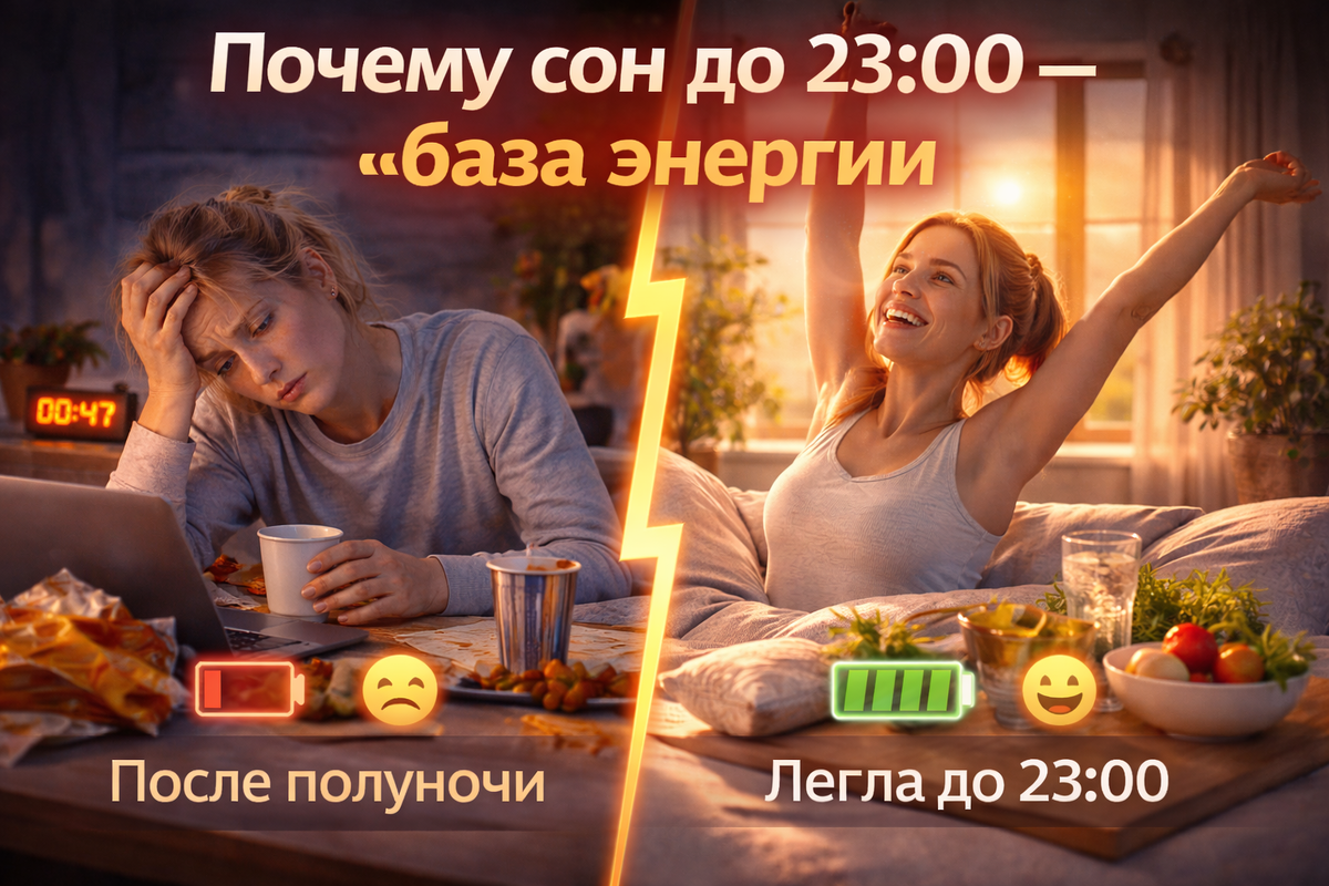 Вы можете спать 7–8 часов — и всё равно чувствовать себя разбитым. Можете «досыпать» по выходным — и не ощущать восстановления. Часто дело не в количестве сна, а во времени отхода ко сну. Сон до 23:00 и сон после полуночи — для организма это два разных сценария. Разберёмся, почему более ранний сон часто связывают с энергией днём и как учитывать свои биоритмы без фанатизма. Современный ритм жизни легко сдвигает сон за полночь: работа, сериалы, соцсети, искусственный свет. При этом распространено убеждение: «Если я набрал 7–8 часов, значит всё в порядке». Но организм живёт не только по будильнику, а по циркадным ритмам — внутренним биологическим часам. Они чувствительны к свету, темноте и времени суток. У взрослых людей выработка мелатонина — гормона, который запускает сон — начинает расти вечером. Если в этот момент мы бодрствуем под ярким светом, мозг получает сигнал: ночь ещё не началась. В результате сон становится менее глубоким, а восстановление — менее эффективным. Важно и то, чт