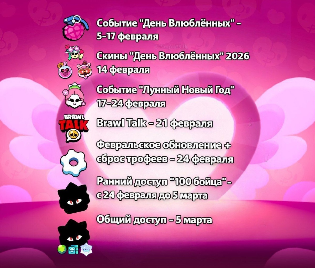 На этот месяц запланировано несколько ивентов, среди которых следующее: — Скины «Бравлентин» выйдут в продажу уже 14 февраля; — Событие «Лунный Новый Год» начнется 17 февраля, тогда же и выйдут скины; — Brawl Talk выйдет 21 февраля; — Новое обновление и переработка трофейной системы планируется 24 февраля; — 100-й персонаж должен выйти 24 февраля в раннем доступе. ✅Новости по Clash Royale - ТЫК 💬Новости по Roblox - ТЫК Мир Supercell. Подписаться