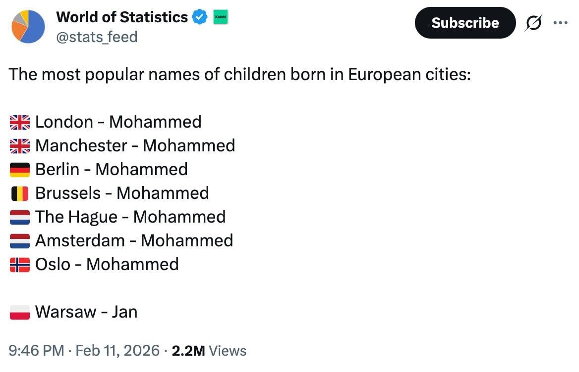 Имя Мухаммед стало самым популярным среди новорождённых в ЕС в 2025 году