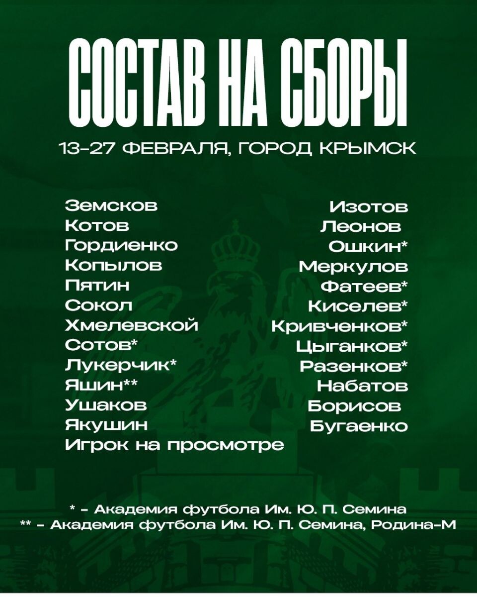 В ФК "Орел" опубликовали состав, в котором команда отправилась в Крымск на ежегодные зимние сборы. Там есть один один неназванный футболист, который по итогам тренировок может стать новичком "зелено-белых". Как часто бывает в низших лигах, его фамилия не раскрывается. Но известно, что на просмотре у "орлов" только один человек. Сборы продлятся до 27 февраля. Орловцы сыграют с четырьмя соперниками, которые будут тренироваться в Крымске в то же время. Это "Кубань-2", "Севастополь", "Ижевск" и курский "Авангард".
