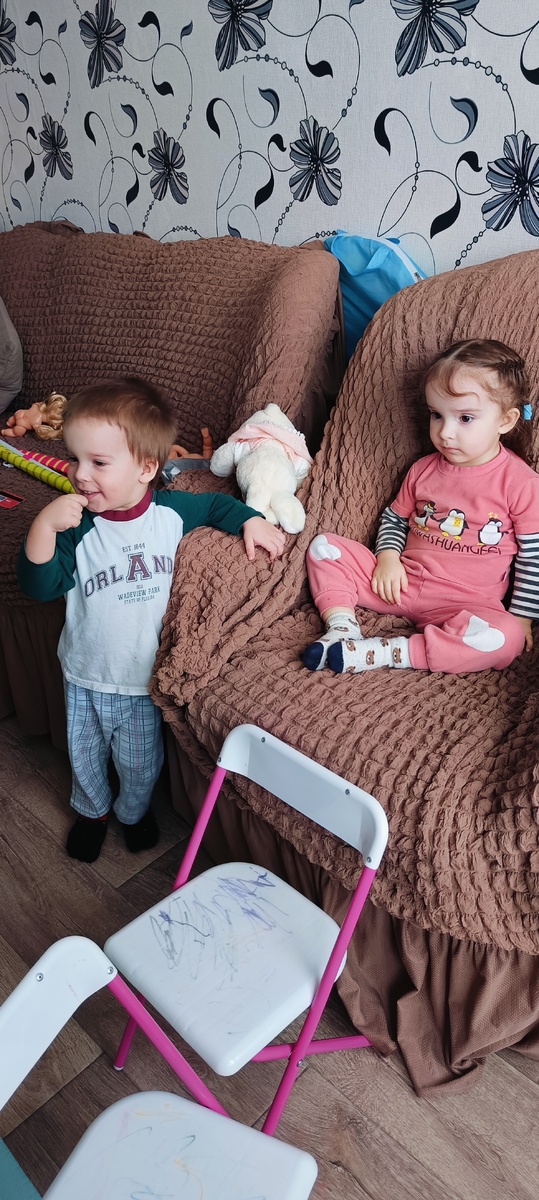 Дед вытащил игрушки из-под дивана, шкафов, пропылесосил. Я полы помыла. Двойняшки очень помогали тем, что старались не мешать. Сева хотел деду помочь пылесосить. Дед сказал, чтобы Сева свой пылесос взял. Севе такая идея не понравилась. Он направился к Амелии, которая сидела на кресле, и сказал: "Деда пиесосит, не месяй"