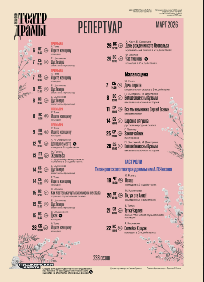 Рязанский театр драмы опубликовал репертуар на март. Об этом сообщает пресс-служба театра. В марте рязанцы смогут посетить премьеры, классические постановки, детские спектакли и гастроли Таганрогского театра драмы им. А. П. Чехова. Главной премьерой марта станет комедия Р. Тома «Ищите женщину» (16+). Спектакль будет показан несколько раз в течение месяца: Также зрителей ждёт спектакль-променад «Дух Театра» (12+), который будет представлен несколько раз, в том числе 7-8 марта (сб-вс) и 14 марта (сб). Помимо этого, с 19 марта в Рязани представят постановки таганского театра драмы имени Чехова. Гастролеры пробудут в городе до 22 марта. С подробной афишей можно ознакомиться на фото.