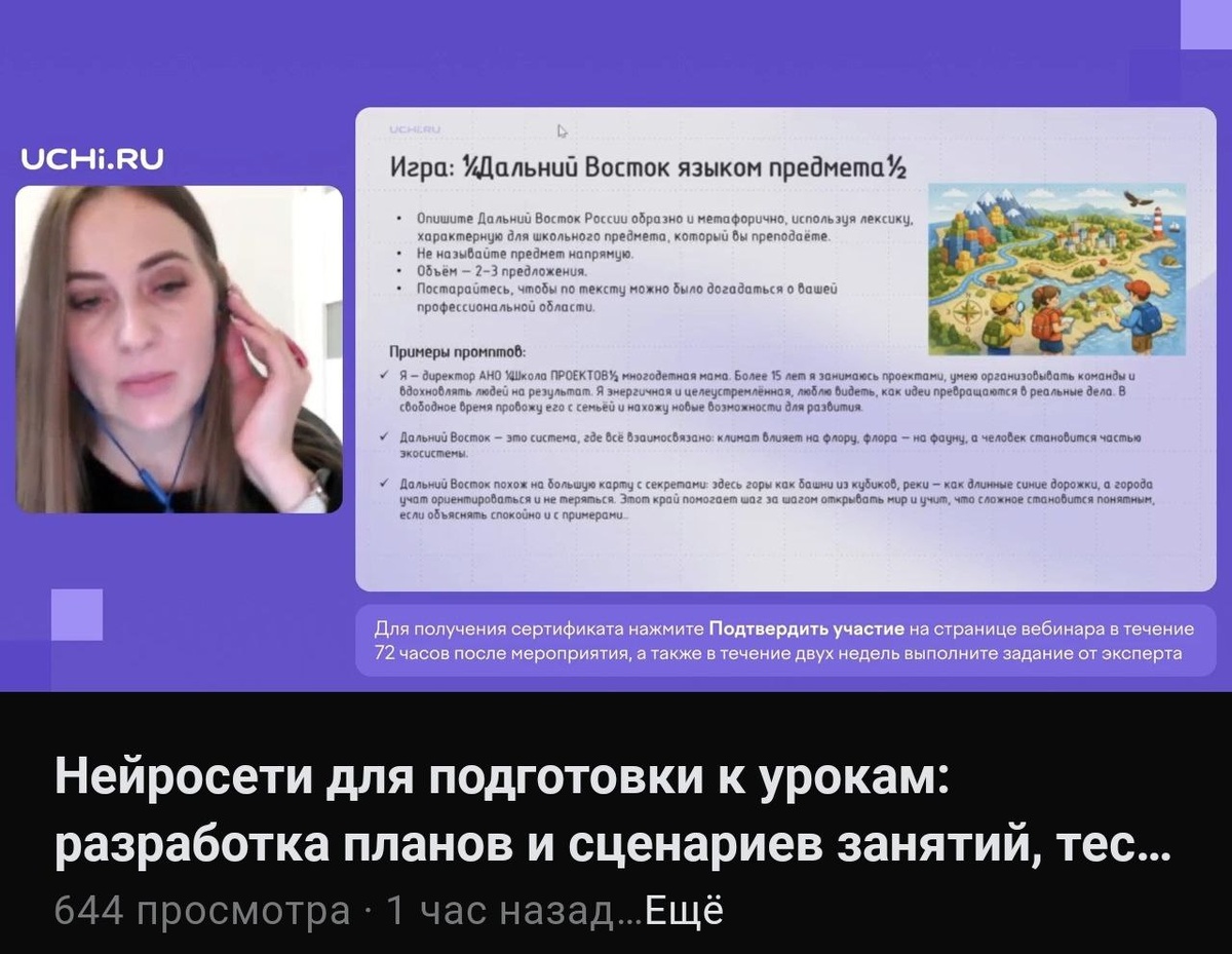 Для педагогов Дальнего Востока провела вебинар от УЧИ.РУ "Используем нейросети для подготовки к урокам: разработка планов и сценариев