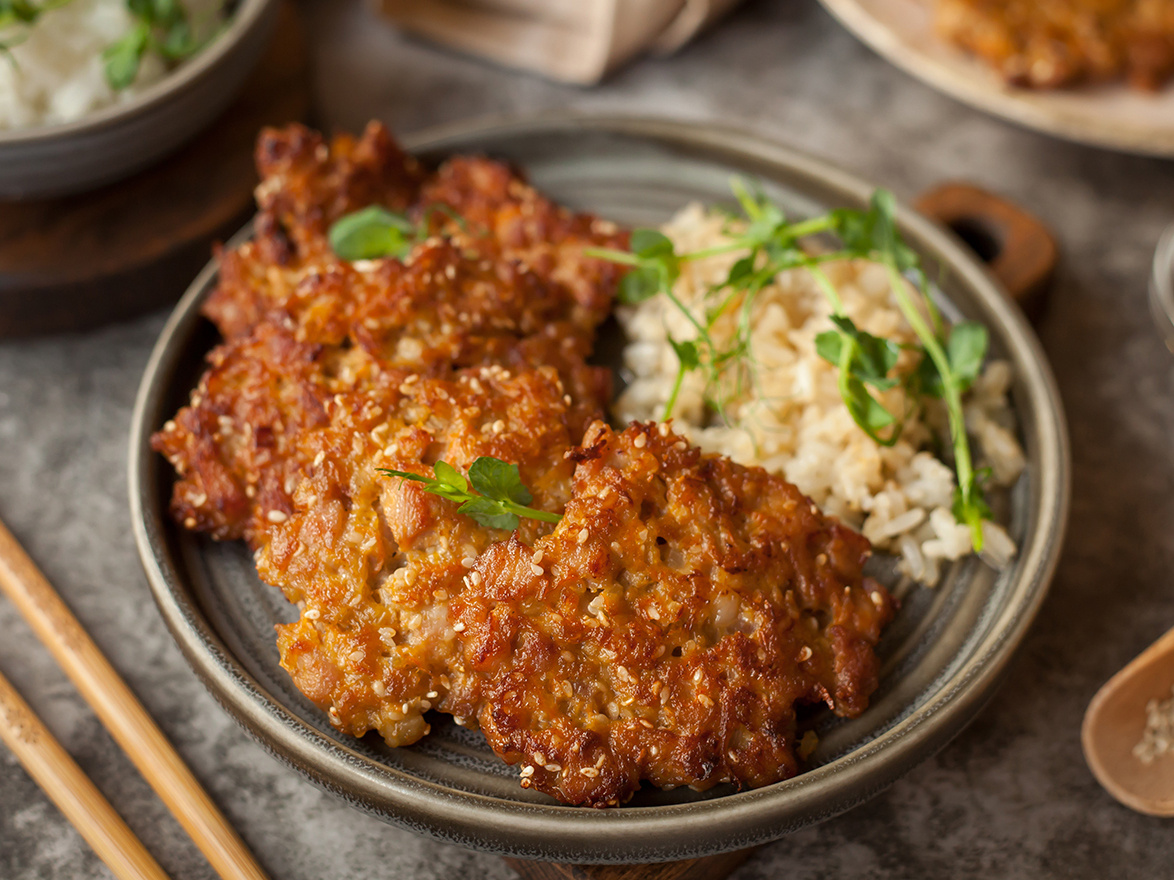 Текстура и впрямь получилась шикарная: сверху аппетитная золотистая корочка, а внутри сочные, упругие кусочки свинины. С горячим рассыпчатым рисом - просто отличное сочетание. Вкус насыщенный, с легкой пряной ноткой за счет соевого соуса и чеснока, но без излишней остроты. Попробуйте - привычная свинина точно раскроется по-новому... Полный список ингредиентов - в конце⤵️ Берем 450 г свинины с жирком без кости. Лучше лопаточно-шейную часть или шею, предварительно зачищенную от пленок. Мясо слегка подмораживаем 20-30 минут, чтобы легче резалось. Острым ножом нарезаем его очень мелким кубиком, практически в фарш, но без мясорубки. Добавляем 100 г репчатого лука, нарезанного максимально мелко. Трем на мелкой терке 70 г моркови и 3 зубчика свежего чеснока. Все отправляем к мясу. Вбиваем 1 яйцо категории С-1. Вливаем 4 ст. л. соевого соуса. Кладем 3 ст. л. майонеза и 0.5 ч. л. молотой смеси перцев. Перемешиваем до однородности. Больше фото смотрите тут: Добавляем 3 ст. л. кукурузного крахмал
