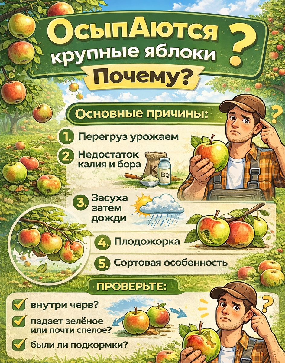 Причина почти никогда не в «весе». Если яблоки крупные и массово осыпаются до съёма — тут обычно работает один или несколько факторов. Основные причины: 1. Перегруз урожаем Деревья 8–10 лет уже в полной силе. Если завязи было много и не проводилось прореживание — дерево само «сбрасывает лишнее. Причём осенью это может быть массово! 2. Недостаток калия и бора При дефиците калия плодоножка слабее держит плод. Бор — влияет на удержание завязи и качество тканей. Если яблоки крупные, но падают без гнили — это очень похоже на питание. 3. Засуха → потом дожди Резкие перепады влаги вызывают стресс. Дерево избавляется от части плодов. 4. Плодожорка Если внутри червивые — всё ясно. Такие яблоки осыпаются первыми. 5. Сортовая особенность На что обратить внимание: • Плод падает зелёным или уже с окраской? • Есть ли внутри ход червя? • Плодоножка сухая или отрывается с кусочком веточки? • Были ли подкормки калием летом? Что можно сделать: • Весной — прореживать завязь (оставлять 1 плод на 10–15 см