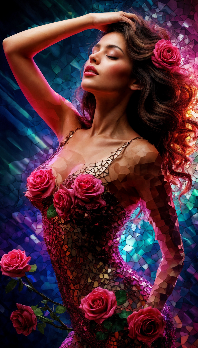 💫Добро пожаловать в мир НейроМагии✨ Сегодня — галерея образов, где каждая Дива чувственна и прекрасна. Она окружена розами и дышит ими. Мозаика на ее теле — отпечаток этого дыхания: каждая грань — вспышка света, каждый разлом — вдох.