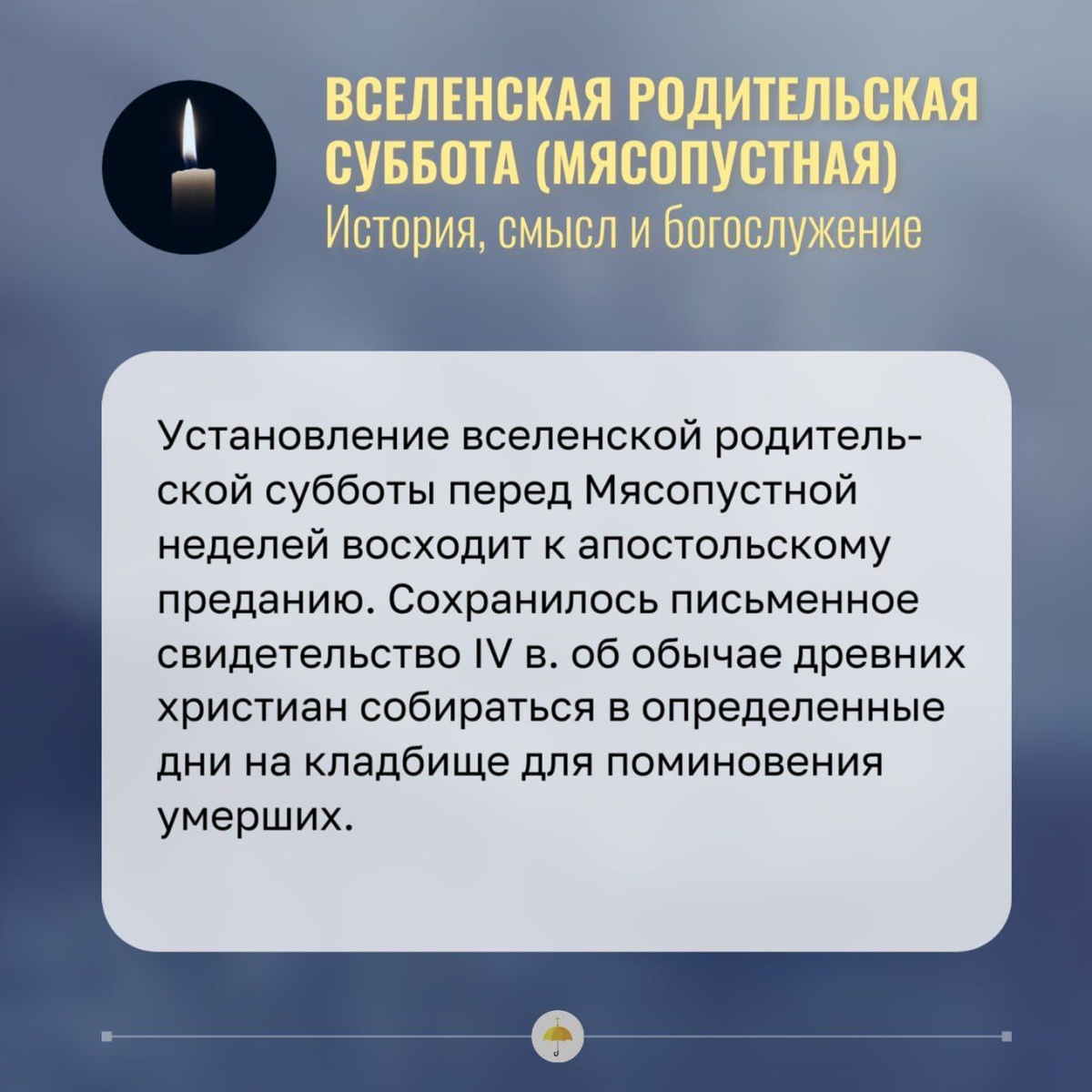 Завтра Вселенская родительская суббота (Мясопустная). В этот день в храмах происходит поминовение усопших. Рассказываем о богослужении, смысле и истории этого дня на карточках.