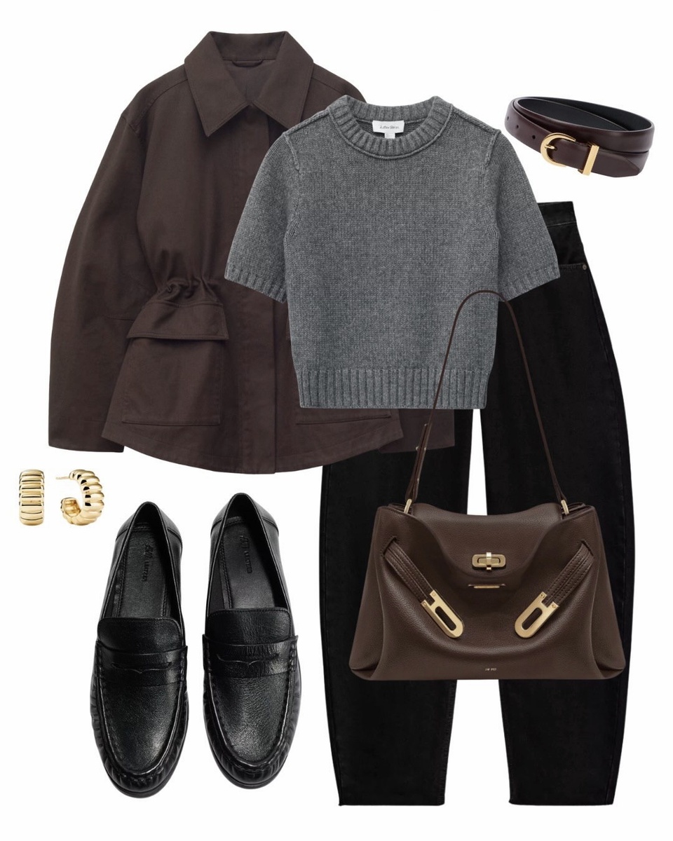 Секрет этого комплекта — в продуманной палитре и правильных фактурах. Шоколад и графит дают глубину, чёрный низ вытягивает силуэт, а золото добавляет тот самый «свет», который делает повседневность более статусной. Такой образ можно носить неделями, меняя лишь одну деталь: вместо лоферов — ботильоны, вместо топа — тонкую водолазку, вместо куртки — пальто. База останется сильной, а впечатление — неизменно собранным.