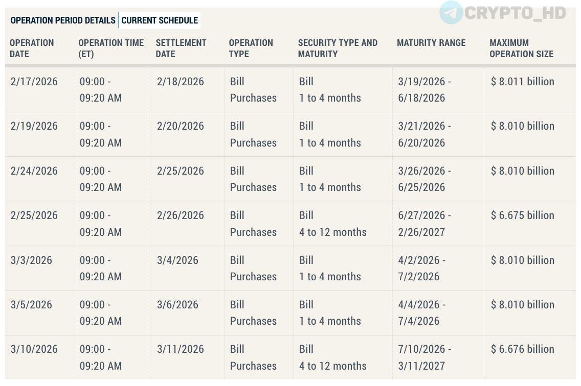 ). График покупок гос. облигаций США: ➤ 17 февраля – покупка на $8,011b. ➤ 19 февраля – покупка на $8,010b. ➤ 24 февраля – покупка на $8,010b. ➤ 25 февраля – покупка на $6,675b. ➤ 3 марта – покупка на $8,010b. ➤ 5 марта – покупка на $8,010b. ➤ 10 марта – покупка на $6,676b. Подробности: читать Прошлый график: смотреть Crypto Headlines