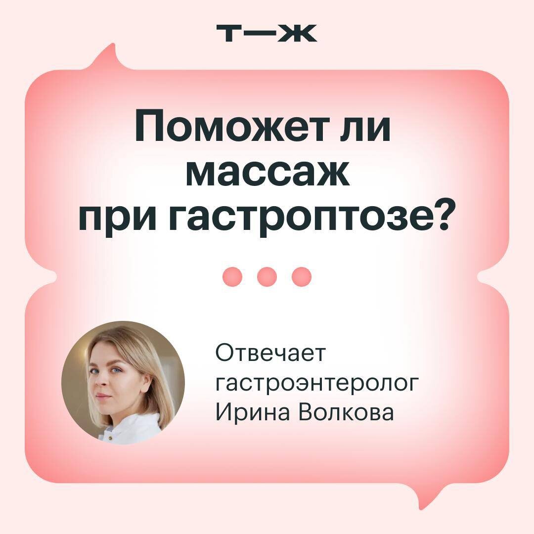 В теории процедура должна «вернуть» орган на место и так решить проблемы с ЖКТ. Обратились к гастроэнтерологу Ирине Волковой за комментарием 👀 Гастроптоз — опущение желудка ниже его обычного анатомического положения. Обнаружить его можно при рентгенографии, компьютерной томографии или УЗИ. 👩🦱 Гастроптоз чаще встречается у женщин. К нему предрасполагают врожденная слабость связочного аппарата, астеническое телосложение, резкое похудение, многократные беременности, тяжелые физические нагрузки, возрастные изменения. 👉 Современные данные указывают на то, что гастроптоз не влияет на здоровье и его не нужно лечить. Опущение желудка протекает бессимптомно и не объясняет наличие каких-либо жалоб. Более того, некоторые исследования показывают, что у людей с гастроптозом диспепсические явления, то есть изжога, отрыжка, вздутие, чувство переполнения и боли в животе, встречаются даже реже, чем у людей с анатомически нормальным расположением органа. 🫱 Массаж не способен поднять желудок