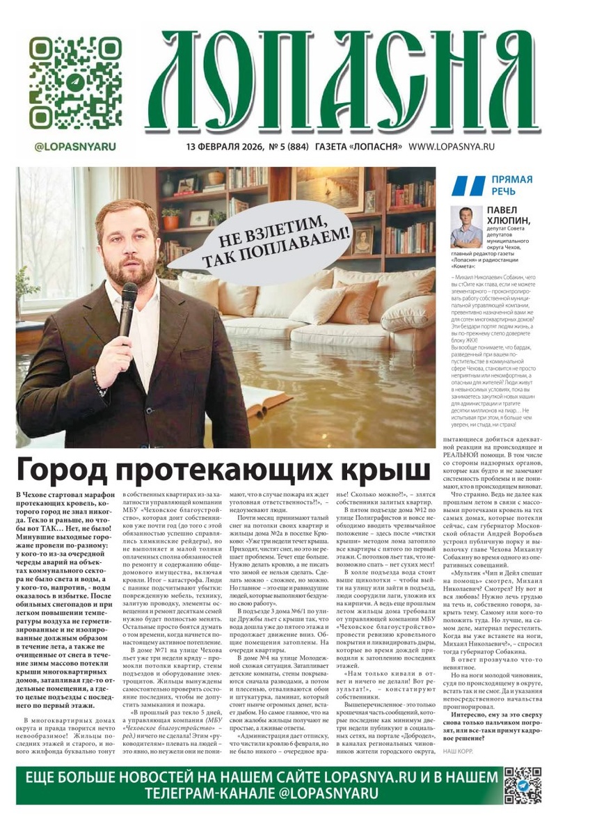 💯💯💯💯 ВЫШЕЛ В СВЕТ 5-Й В 2026 ГОДУ НОМЕР ЕЖЕНЕДЕЛЬНИКА «ЛОПАСНЯ» Читайте в газете: 📻ГОРОД ПРОТЕКАЮЩИХ КРЫШ. В Чехове жильцы верхних этажей тонут в квартирах из-за халатности УК МБУ «Чеховское благоустройство», которая доит собственников уже почти год. 📻И ДАЖЕ МАХ НЕ ПОМОГАЕТ. Добиться устранения причин затопления подвалов нечистотами жителям Чехова не помогают даже обращения в мессенджере MAX – там измученных горожан тоже игнорируют. 📻ОДН В ЧЕХОВЕ: КРУЧУ, ВЕРЧУ, ЗАПУТАТЬ ХОЧУ. На «выездной тематической администрации» чиновники снова пообещали жителям провести проверку начислений платы за общедомовое потребление ресурсов и содержание общедомового имущества. А пока велели платить сколько написано и «не нагнетать». 📻ОБЕЩАННОМУ НЕ ВЕРИТЬ! Крохотный размер обещанного главой округа Собакиным перерасчета за отопление привел граждан в ярость. 📻ЧЕХОВ 202? Коллективную жалобу в прокуратуру и следственные органы написали жители поселка Столбовая-2. 📻ВЫЖИВШИЙ. Житель Чехова, уча