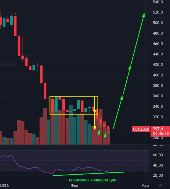 ☕️ Какао 🟢По какао писал в прошлую субботу. Там была новая конвергенция, которая снова была сломана. Какао никак не развернется. 🟢В настоящий момент нет ничего кроме двух сигналов на покупку на дневке. НО! Из желтого прямоугольника мы вышли на его высоту вниз, то есть цель отработали. Если нарисуем разворот, то появится новая конвергенция. Разворотных свечек до сих пор нет. 🚗 Тем не менее, товар этот сезонный, и бесконечно падать он не может. Ждем формирование разворотной свечки, и можно будет потом держать тренд довольно долго. Жду завершение падения по какао на этой неделе! #какао #cc1 #cocoa #bogdanoffinvest $CCH6