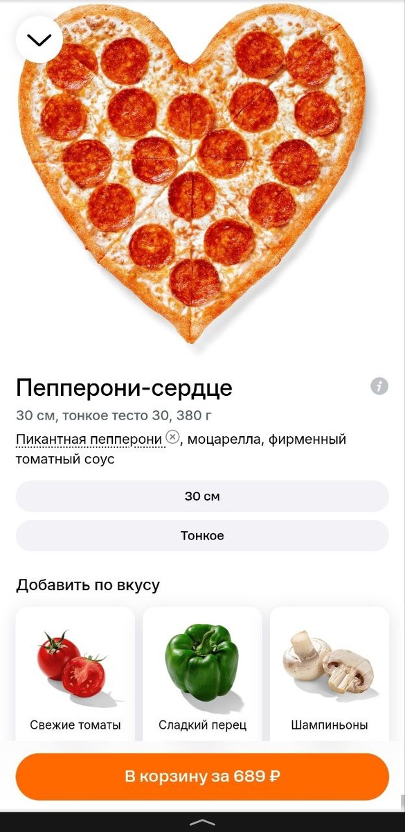 По сути, классическая пепперони, только в необычной форме. Главный прикол: стоит новинка столько же, сколько обычная пепперони 30 см, но весит почти на 200 граммов меньше — примерно минус два куска пиццы. влюблённые геометрию не наблюдают 🙉