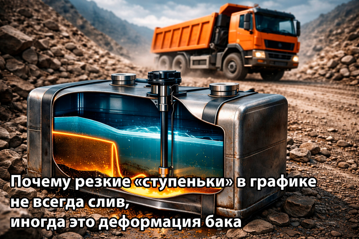 В практике топливного аудита резкие вертикальные падения на графике датчиков уровня топлива традиционно трактуются как сливы. Логика понятна: быстрый минус 20–80 литров без движения — классическая аномалия. Однако в ряде парков до 12–18% таких «сливов» при проверке оказываются не хищениями, а следствием деформации топливного бака. Ошибка интерпретации здесь стоит бизнесу не только времени, но и управленческих решений — от штрафов до необоснованных увольнений. Как выглядит «ложный слив» в телематике Типовые признаки ступеньки, вызванной не хищением: — Падение уровня без открытия заправочных операций — Отсутствие корреляции с GPS-координатами риска (АЗС, стоянки) — Нет сопутствующего движения топлива по CAN-данным — Событие происходит при изменении рельефа или загрузки Ключевая особенность: через время уровень частично «возвращается» без заправки. Это критичный маркер геометрической, а не фактической потери топлива. Физика процесса: как деформация даёт ступеньку Наиболее уязвимы: — Тонко