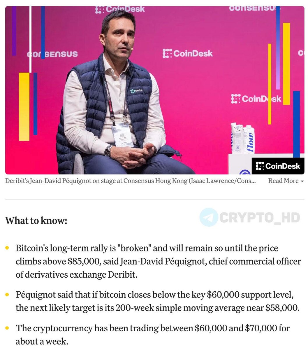 ➠ Топ-менеджер Deribit считает, что восходящий тренд BTC сломан – и не возобновится, пока Биткоин не вернется к отметке выше $85,000. ➠ Сейчас BTC топчется в диапазоне $60,000-70,000 – это на 45% ниже октябрьского максимума. ➠ Четвертая неделя снижения подряд. Ключевой уровень поддержки $85,000 был пробит в конце января. ➠ Если Биткоин закрепится ниже $60,000 – следующая остановка около $58,000 (200-недельная скользящая средняя). ➠ Именно в районе $58,000-60,000 исторически формировалось дно медвежьих рынков (последний рубеж обороны быков) – здесь трейдеры начнут искать точку входа. Crypto Headlines
