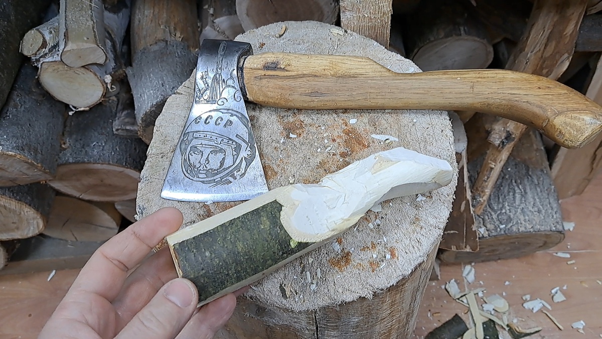 Ложку буду изготовливать из липы. Подобрал подходящее по размеру заготовку. Грубо обработал топором, сняв не нужный массив и придал форму для удобной дальнейшей обработки ножом. При помощи ножа начал формировать морду медведя Формирую уши и очертания морды медведя. Придаю форму ушам и детализирую медведя. При помощи ложкореза и изогнутой стамеки выбираю черпало. Для удобства использую два ложкореза с левой и правой заточкой. Финишная подрезка ножём. Голову окрашиваю морилкой на водной основе в несколько слоёв и даю высохнуть. Цвет придаст реалистичности нашему медведю. В конце пропитываю льняным маслом, оно рафинированное-отбеленное для художественно-живописных работ. Это защитит ложку от влаги. Ну и смотрим, что получилось по факту.