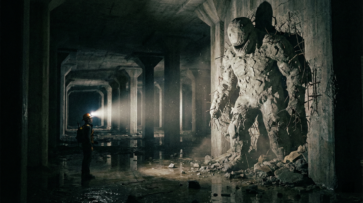 Существо казалось слепленным из того же материала, что и само здание. Его кожа была серой, шершавой, покрытой коркой засохшего бетонного молочка и пыли. Бугры мышц напоминали мешки с цементом. Оно стояло неподвижно, сливаясь со стеной, если бы не тень, которую отбрасывал фонарь.