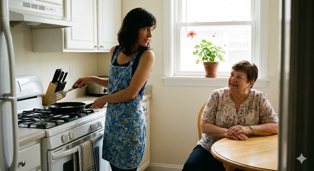 Потом я выросла. Уехала. Приезжала по воскресеньям — и каждый раз заставала одну картину. Мама у плиты. Отец за столом. Тарелка с тёмными оладьями.