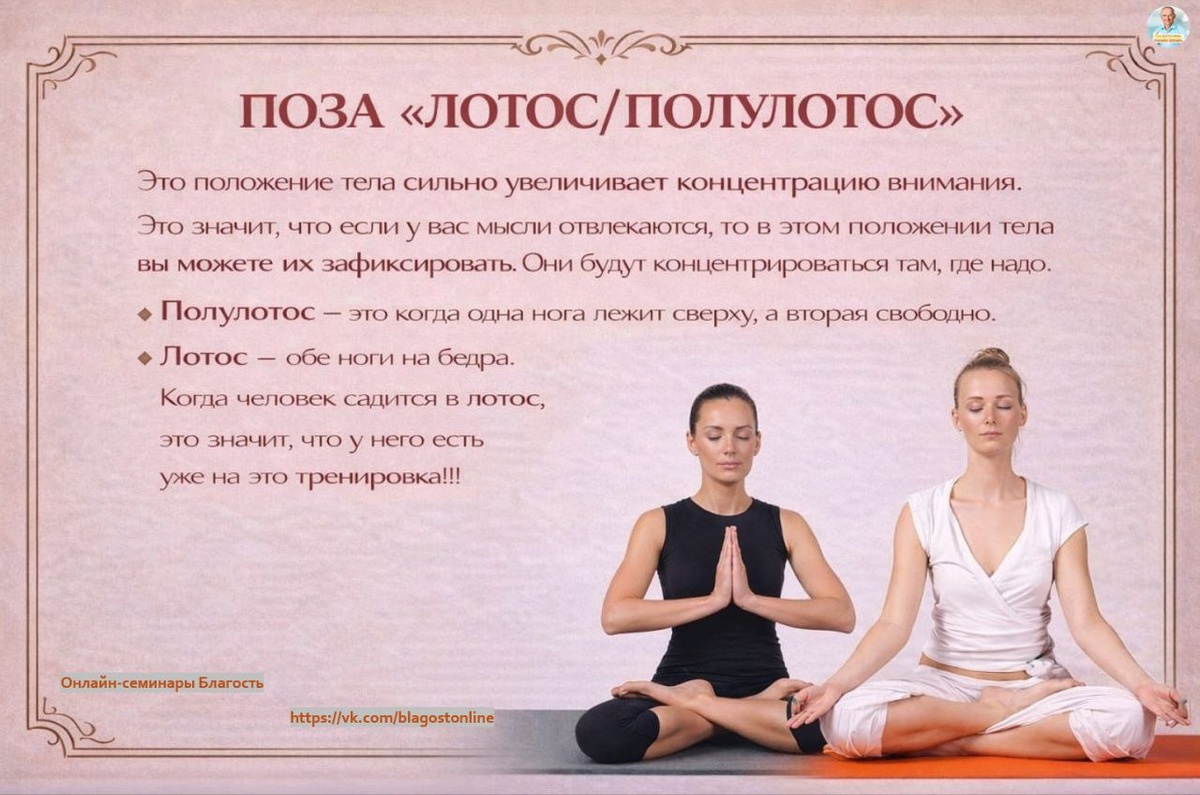 ” Это положение тела сильно увеличивает концентрацию внимания. Это значит, что если у вас мысли отвлекаются, то в этом положении тела, вы можете их зафиксировать. Они будут концентрироваться там, где надо. Полулотос - это когда одна нога лежит сверху, а вторая свободно. Лотос - обе ноги на бедра. Когда человек садится в лотос, это значит, что у него уже есть на это тренировка!