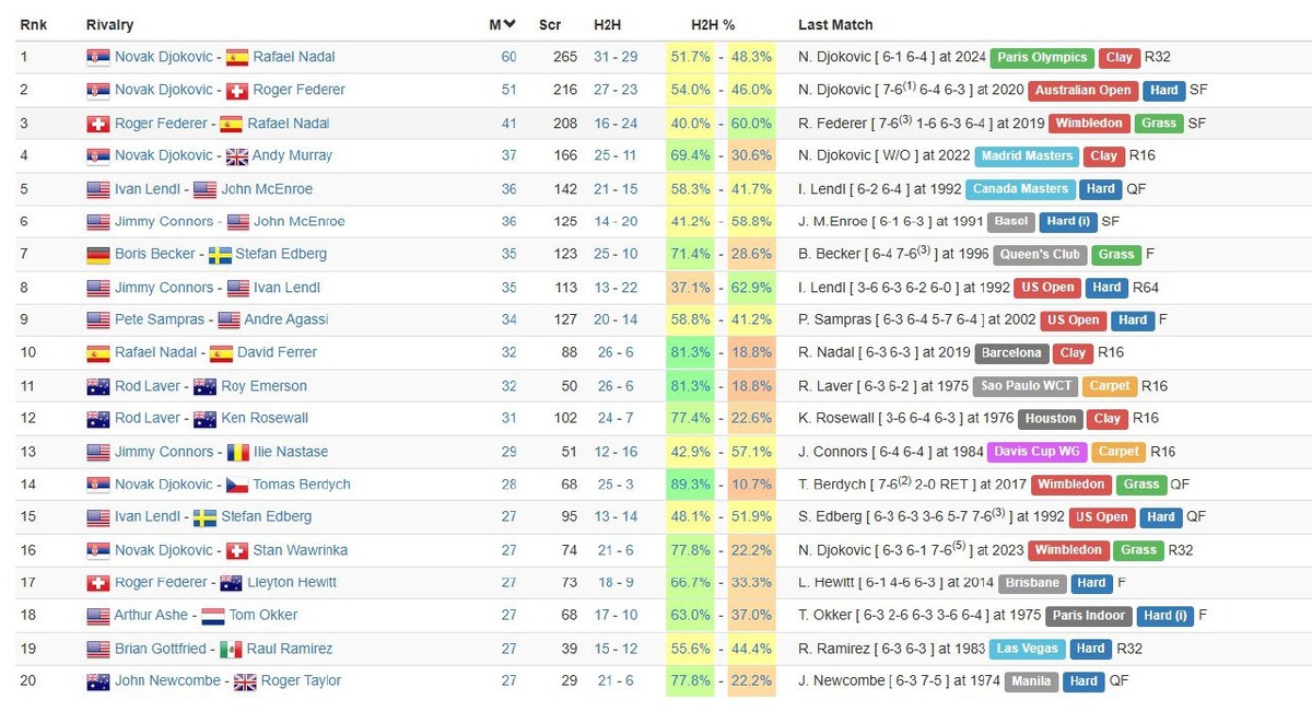 : 1. Новак Джокович — Рафаэль Надаль (31-29) 2. Новак Джокович — Роджер Федерер (27-23) 3. Роджер Федерер — Рафаэль Надаль (16-24) 4. Новак Джокович — Энди Маррей (25-11) 5. Иван Лендл — Джон МакЭнрой (21-15) 6. Джимми Коннорс — Джон МакЭнрой (20-14) 7. Борис Беккер — Стефан Эдберг (25-10) 8. Джимми Коннорс — Иван Лендл (13-22) 9. Пит Сампрас — Андре Агасси (20-14) 10. Рафаэль Надаль — Давид Феррер (26-6) 11. Род Лейвер — Рой Эмерсон (8-3) 12. Род Лейвер — Кен Розуолл (12-16) 13. Джимми Коннорс — Илие Настасе (25-3) 14. Новак Джокович — Томаш Бердых (25-3) 15. Иван Лендл — Стефан Эдберг (13-14) 16. Новак Джокович — Стэн Вавринка (21-6) 17. Роджер Федерер — Ллейтон Хьюитт (18-9) 18. Артур Эш — Том Оккер (17-10) 19. Брайан Готфрид — Рауль Рамирес (15-12) 20. Джон Ньюкомб — Роджер Тейлор (21-6) Подпишись на Эйс и точка