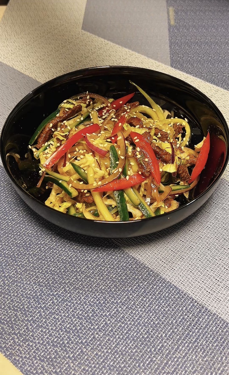 Нарезаные овощи складываем в салатник и добавляем к ним говядину с соусом. Аккуратно перемешиваем.