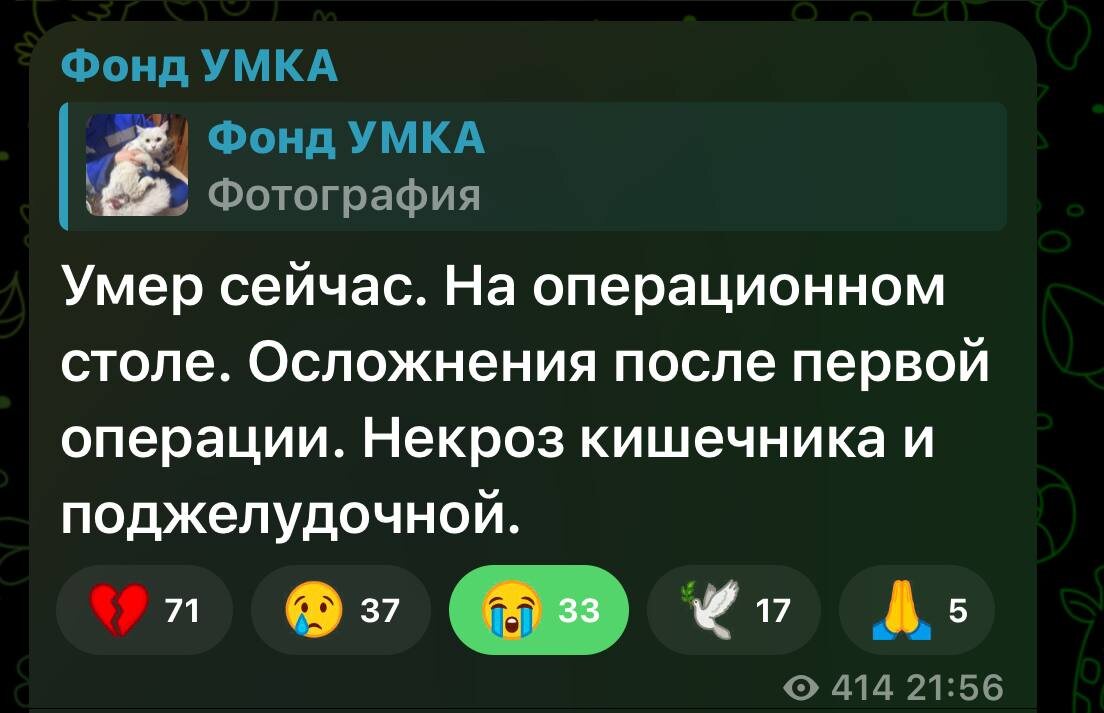 … ненавижу нести их… Ненавижу потом сидеть и плакать… Ненавижу саму ситуацию эту… Но, мы живем пока можем чувствовать… я могу сказать лишь спасибо 🙏 спасибо Старбаксу - он боролся и старался, он дал нам возможность себя узнать, пусть и на такое короткое время. Спасибо врачам - которые боролись за него, которые шли и делали, даже когда не их смена, даже когда шансов почти нет, что они несли эту новость нам и давали весь расклад… Просто хочу сказать СПАСИБО…