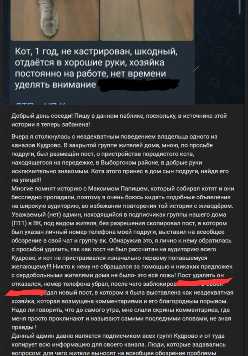 Анна Щукина админ П11 (она же Виктория Школьная, которая сидит с разных фейков, и она же "мастер обрезанных скриншотов") решила поиграть в клевету и выкатила пост о "злом админе ДТП и ЧП Кудрово". Анна утверждает, что информация о коте была "украдена" администратором из домового чата, а в просьбе удалить публикацию якобы было отказано. В качестве доказательства она выложила в комментариях другой группы обрезанный диалог. Но мы выложим полную версию диалога, где гражданка Анна соглашается с тем, чтобы оставить пост и удалить только номер. Мы только ошиблись с тем, что выставили её в роли хозяйки, такой вариант допускаем. Но после её агрессивных выпадов в общении сложилось такое впечатление. Остальные обвинения в адрес админов также не являются правдой. Кроме прочего наблюдается явное противоречие в показаниях Анны: в одной группе она утверждает, что у хозяйки нет средств и времени на содержание кота, в то время как в другой пишет, что животное просто находится на временной передержке.