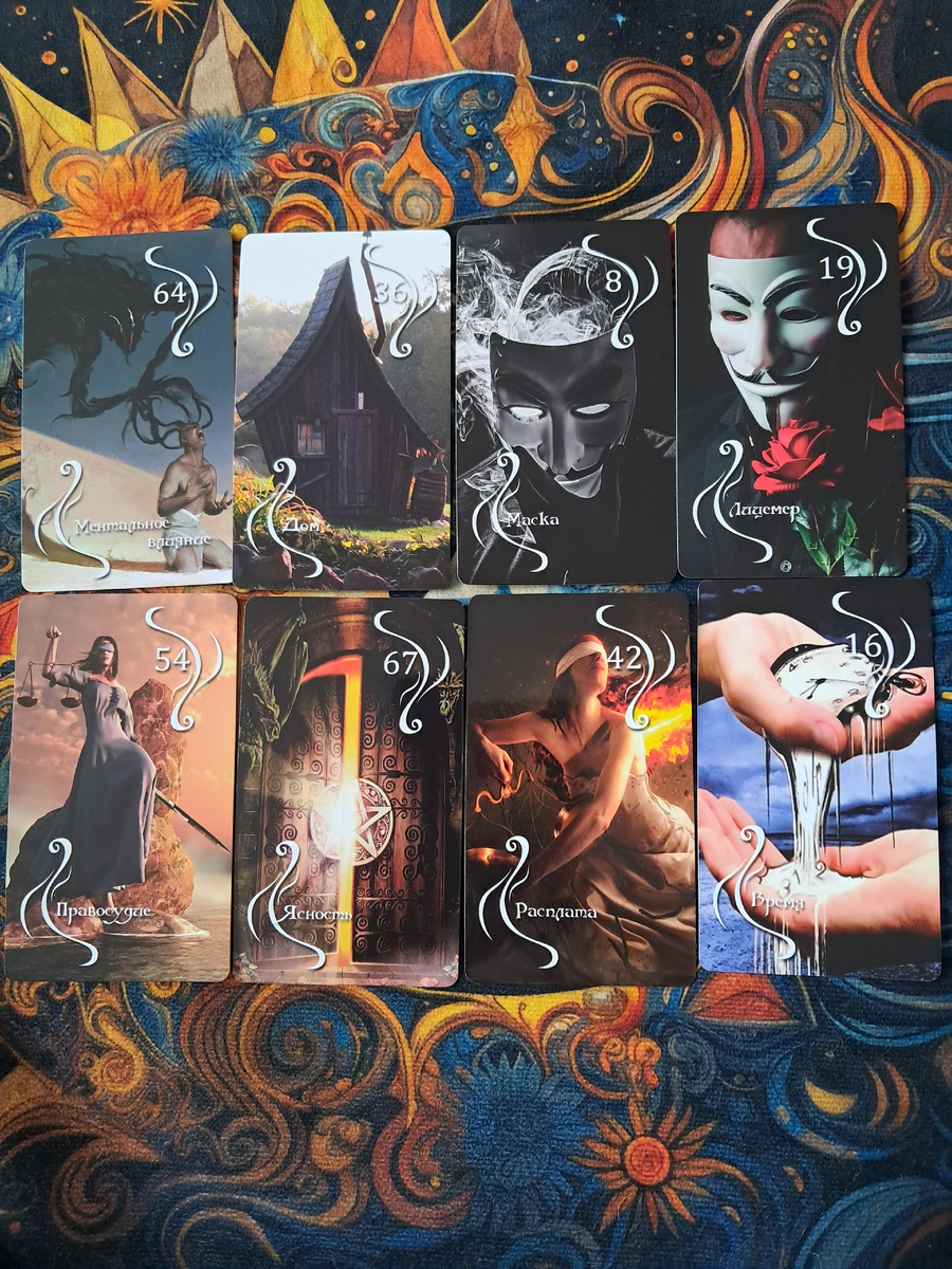 1. Правосудие + Расплата: Это кармический суд рода. «Расплата» часто пугает, но в контексте «светлого наследия» она означает освобождение от груза. Все, что было скрыто под «Маской» (лицемерие, подавление), теперь требует баланса. Это шанс расплатиться со старыми долгами, чтобы не передавать их дальше. Правосудие восстановит порядок, который был нарушен лицемерием предков.