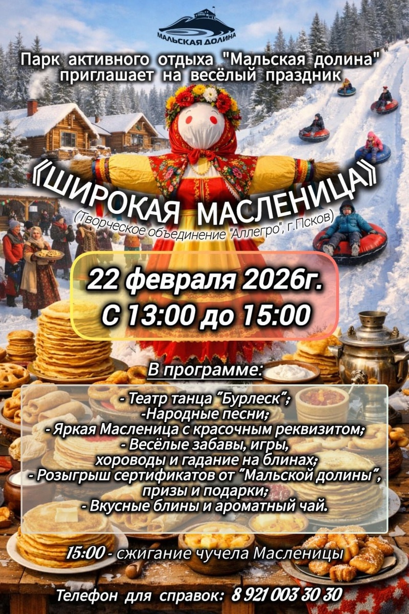 » 🥞 В программе: ✅ Театр танца "Бурлеск", ✅ Народные песни, ✅ Яркая Масленица с красочным реквизитом, ✅ Весёлые игры, хороводы и гадание на блинах, ✅ Розыгрыш ценных призов от "Мальской Долины", ✅ Вкусные блины с ароматным чаем. ⏰ Начало гуляний в 13:00, сжигание Масленицы в 15:00. Оставайтесь с нами #НашаПсковскаяобласть