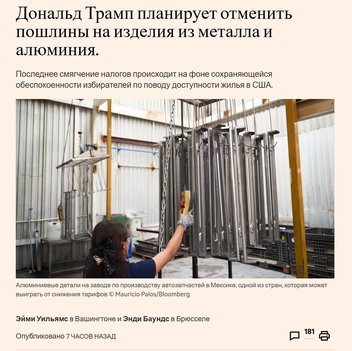 А что случилось? Трамп планирует снизить некоторые пошлины на сталь и алюминий, поскольку борется с кризисом доступности товаров, который подорвал его рейтинг одобрения в преддверии промежуточных выборов в ноябре Согласно опросу исследовательского центра Pew Research Center, опубликованному в этом месяце, более 70% взрослого населения США оценивают экономическую ситуацию как удовлетворительную или плохую Около 52% американцев считают, что экономическая политика Трампа ухудшила положение дел Решение смягчить пошлины на сталь и алюминий, которые были одними из первых, введенных во время второго срока Трампа, принято на фоне заявлений экономистов о том, что американцы оплачивают эти пошлины, что подрывает утверждение президента о том, что бремя ляжет на иностранные компании https://www.ft.com/content/f2eff736-12de-4c33-9826-847d2fdf8be3 @marketheart