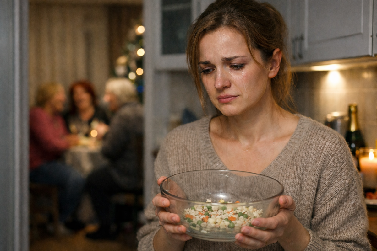 Я стояла на кухне, сжимая в руках салатник с оливье, и чувствовала, как по щекам текут слёзы. За стеной слышался смех моей свекрови и её подруг.