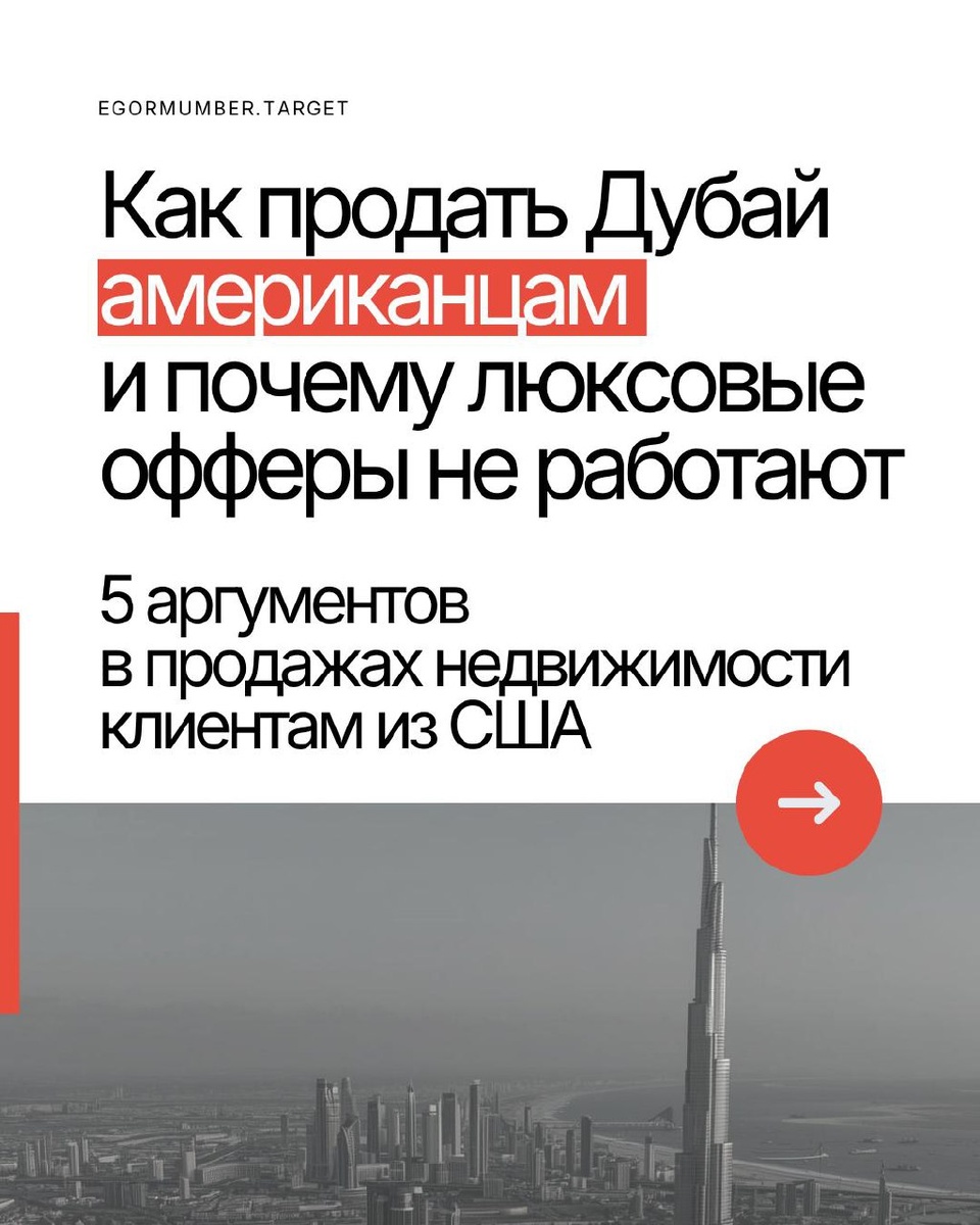 : КАКИЕ АРГУМЕНТЫ НУЖНЫ ИНВЕСТОРУ ИЗ США, ЧТОБЫ КУПИТЬ НЕДВИЖИМОСТЬ В ОАЭ. Лиды из тран СНГ дорожают, направление преегрето, цикл сделки раздувается до полугода и качество оставляет желать лучшего. Делитесь этим постом с коллегами, им точно будет полезно!