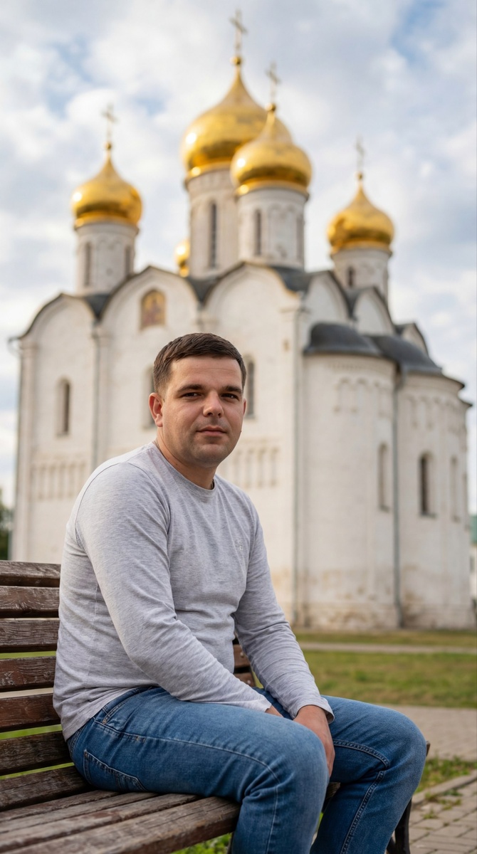 🤖Генерировать можно здесь: 👉БОТ ДЛЯ ГЕНЕРАЦИИ Режим Nano Banana Pro 4К ИНСТРУКЦИЯ "Фотореалистичный travel‑портрет мужчины с референсного фото. Он сидит на скамейке перед белой православной церковью с золотыми куполами, светло‑серый лонгслив, синие джинсы. Мягкий дневной рассеянный свет, частичные облака, лёгкий тёплый контраст, ракурс чуть ниже уровня глаз, 3/4, кадр по пояс/до колен, объектив 35–50 мм, f/1.8–f/2.8, средняя глубина резкости (лицо в резкости, храм слегка размытый), ultra‑detailed, 4K–8K, HDR, documentary/travel lifestyle. Без водяных знаков, без текста, без артефактов. Формат 9:16." СГЕНЕРИРОВАТЬ 📸 ПОДПИСАТЬСЯ 💬