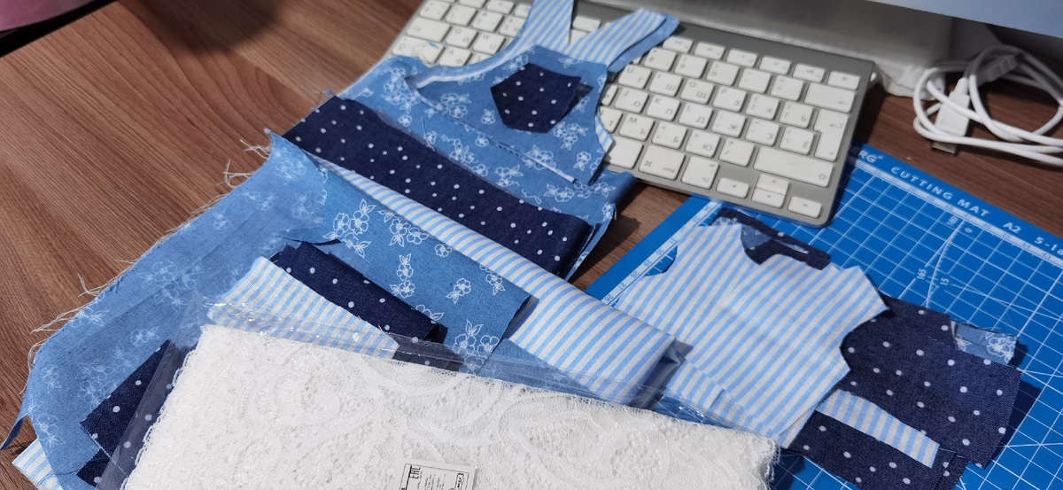Итак, в ход были пущены: два куска ткани под джинсу (синий в горошек и голубой в цветочек), хлопок в голубую полоску, немного белого батиста (на фото его нет) и темно-синее кружево для отделки (его тут тоже нет).