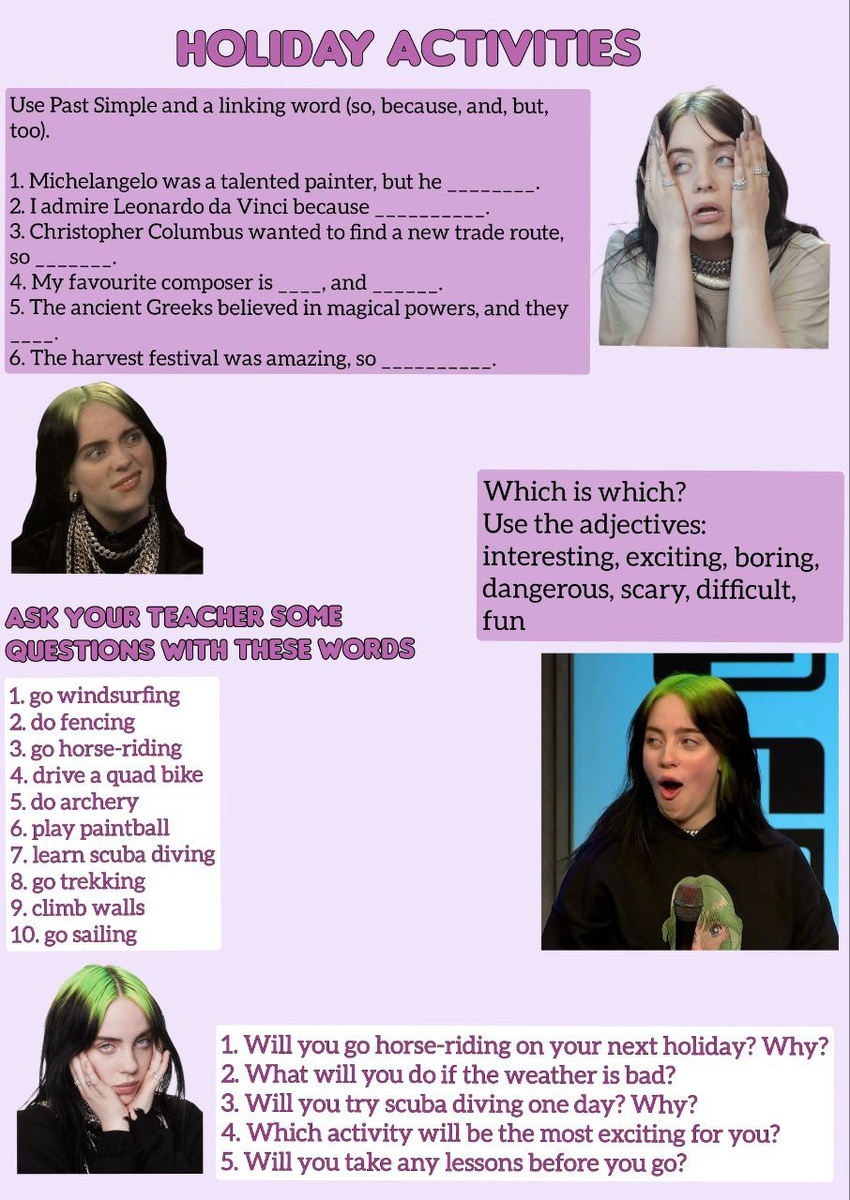 "🥳 Этот урок идёт сразу после урока "Famous people", которым я делилась выше👆 И сегодняшняя наша героиня - Billie Eilish🫦 Но что-то не складывается... Billie Eilish.. Holiday activities.. Но на самом деле она поможет нам отработать linking words, которые есть в первом задании. Нужно будет составить похожие предложения про нашу сегодняшнюю героиню💯 ❓Все знают что такое linking words и с чем их едят? прикрепляю голосование и проверим:)